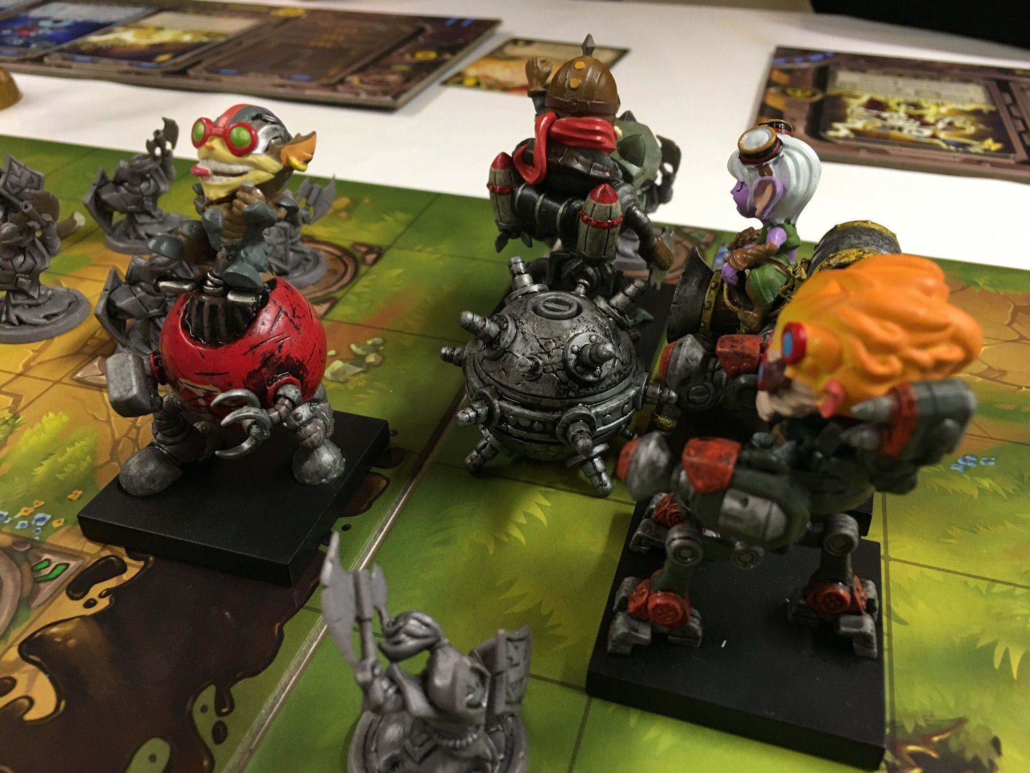 Diese erste kleine Prüfung absolvierten wir mit Bravour. Da haben sich die vielen Partien Robo Rally doch gelohnt 😉 Wir konnten also gleich mit dem nächsten Teil des Tutorials fortfahren. Hier durften wir dann (endlich) die Minions (Gegner) vom Feld fegen. Auch dieses sollte für unsere erfahrene Gruppe natürlich überhaupt kein Problem darstellen.