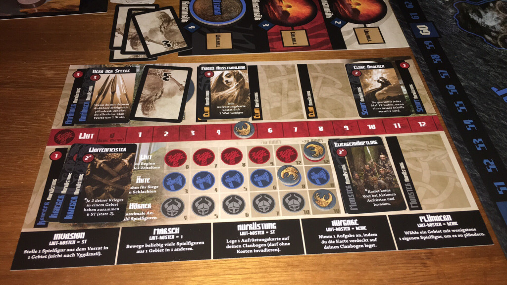 Bei mir lief es irgendwie von Anfang an ich konnte immer Auftragskarten ziehen, die ich erfüllen konnte oder meistens sogar schon hatte und meine Ausrüstungskarten funktionierten auch alle gut zusammen. Ich konnte ordentlich plündern und so meine Clanwerte immer stetig aufleveln. Martin kam anfangs nicht so ganz voran und konnte auch nicht so viele Figuren aufs Feld bringen wie ich, was mir beim Kämpfen natürlich enorm in die Karten spielte.