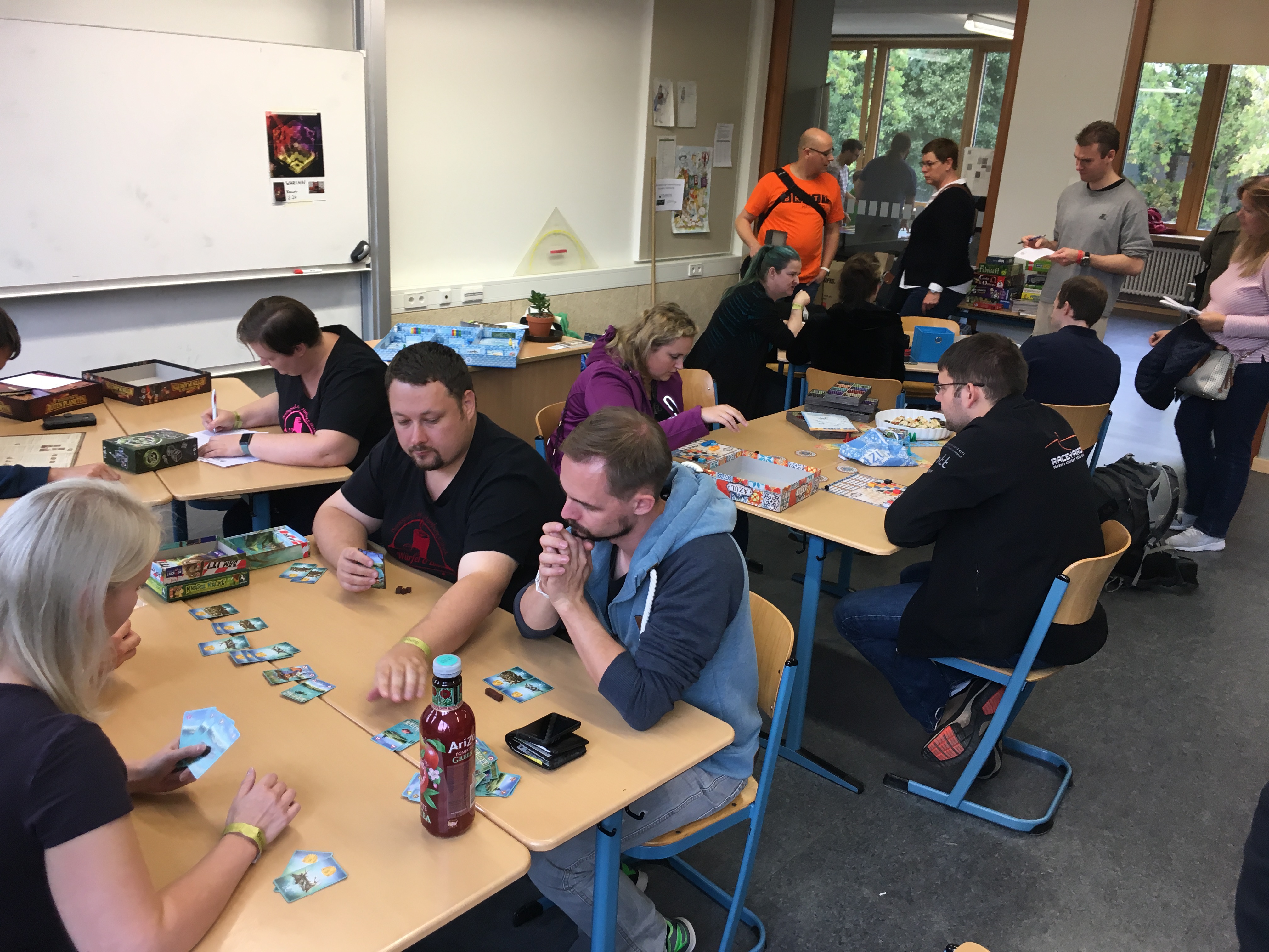 Ehe wir uns ver­sa­hen, war es dann schon 14 Uhr und unse­re Mägen mel­de­ten sich. Damit stand der nächs­te Tages­ord­nungs­punkt fest: Mit­tags­es­sen in der Cafe­te­ria, um schnell vor dem Brett­spiel­quiz noch etwas zur Stär­kung zu uns zu neh­men. Auf dem Weg dort­hin nut­zen die Jungs die Gele­gen­heit, die Floh­markt­ein­käu­fe noch eben zum Auto zu brin­gen, wäh­rend­des­sen Son­ja und ich noch ein­mal beim Atlan­tis Spie­le­la­den vor­bei­schau­ten und auch ein paar Klei­nig­kei­ten besorg­ten. So bekam ich dort die bei­den Mons­ter­pack Erwei­te­run­gen für “King of Tokyo” “Cthul­hu” und “King Kong” und noch­mal das “Cthul­hu Realms”. Letz­te­res hat­te uns beim Spiel zu viert dann doch bes­ser als in unse­rem ers­ten Pro­be­spiel zu zweit gefal­len. Son­ja erblick­te noch eine klei­ne Smash Up Erwei­te­rung und ein ande­res klei­nes Spiel und dabei ver­quatsch­ten wir uns noch mit den net­ten Her­ren vom Atlantis.